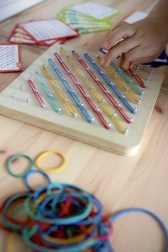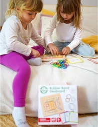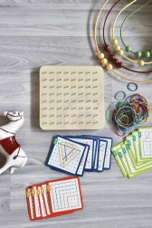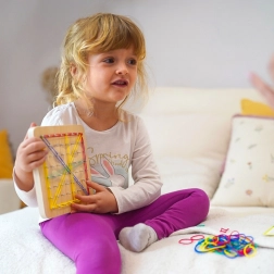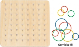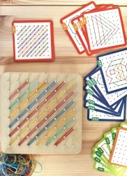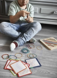 Napenjanje elastik med količki krepi prste, koordinacijo ter uči načrtovati, primerjati in natančno delati po predlogi.