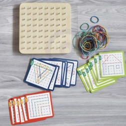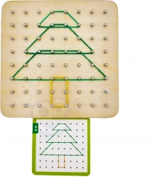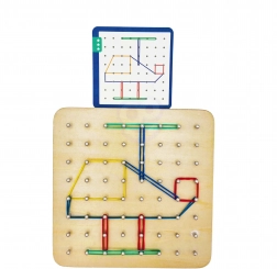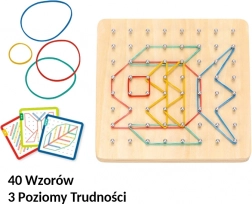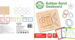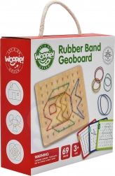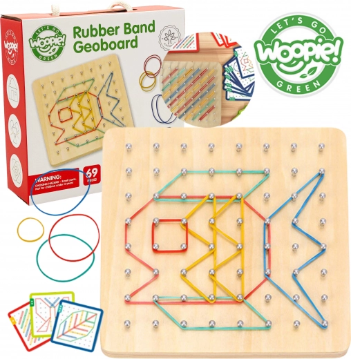 Lesena izobraževalna igrača geoplan blagovne znamke WOOPIE iz serije GREEN prinaša otrokom od 3. leta dalje neskončne možnosti ustvarjanja. Barvite elastike se napenjajo med kovinskimi količki na trdni leseni plošči in tako nastajajo preprosti ali zahtevnejši liki. Otroci lahko sledijo obojestranskim kartam z vzorci ali preizkusijo lastne kompozicije – idealna kombinacija igre in učenja.