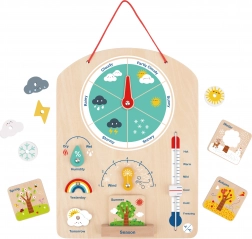 Otroci si s pomočjo vrtljivih kazalcev zabeležijo trenutno vreme, temperaturo in letni čas. Odličen dnevni ritual za jutranje in večerno skupno pogovarjanje ter razvoj besednega zaklada.