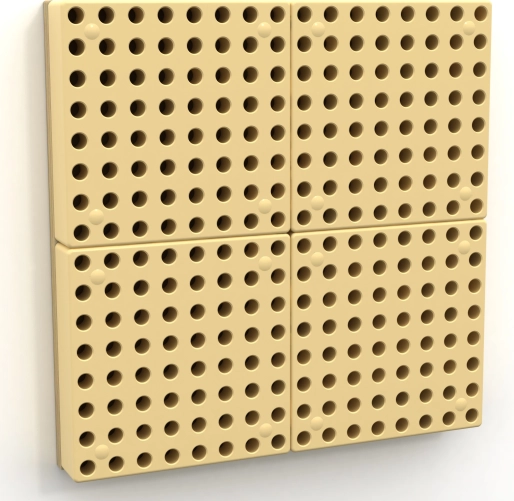 Perforirana plošča iz 4 delov 20 × 20 cm omogoča vstavljanje barvnih zatičev in ustvarjanje izvirnih vzorcev, ki razvijajo fino motoriko in domišljijo.