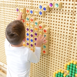 Ploščice s čepki zagotavljajo hitro montažo in demontažo na kompatibilnih pegboardih – idealno za majhne otroške roke.