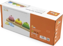 Vsak košček je izdelan iz kakovostnega lesa z zaobljenimi robovi in premazan z varnimi, netoksičnimi barvami. Igrača je zasnovana za vsakodnevno uporabo in je hkrati vizualno spodbudna – idealna za učenje barv, oblik in prvih števil.