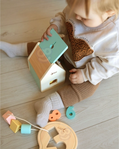 Leseni sortirnik s pokrovom in izrezi spodbuja otroke k prepoznavanju oblik in barv ter krepi koordinacijo oko–roka in prostorsko predstavo.