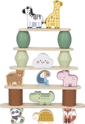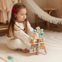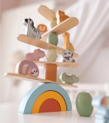Igrača ponuja tri stopnje težavnosti, prilagojene starosti otroka, in je idealna za otroke od 18 mesecev. Med igranjem otroci izboljšujejo ravnotežje, razvijajo sposobnost natančnega manevriranja in gradijo impresivne uravnotežene stolpe z živalmi.
