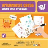 Set je zasnovan tako, da lahko otrok večkrat vadi računanje zahvaljujoč priloženemu izbrisljivemu markerju. Kartice so razdeljene na tiste z odštevanjem in seštevanjem. Za lažje učenje kartice vsebujejo dve ravni – začeti je mogoče s stranjo, kjer matematične naloge dopolnjujejo slike, ki lahko pomagajo pri izračunu rezultata. Druga stran kartic ponuja izračune brez pomoči slik. S tem učnim pristopom vaš otrok ne bo čutil pritiska zahtevnosti nove snovi in reševanje matematičnih primerov bo čisto veselje! Za motivacijo vašega otroka lahko po vsaki pravilno rešeni nalogi v kot kartice narišete srček.