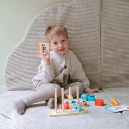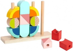 Gladki leseni elementi v pastelnih barvah so prijetni na dotik in varni za majhne roke. Primerno od 2 let dalje.