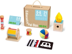 TOOKY TOY predstavlja leseno izobraževalno škatlo 6v1, ki je zasnovana tako, da spodbuja celostni razvoj vašega otroka. Ta škatla vključuje različne igre, ki spodbujajo zanimanje in učenje pri otrocih od 0 do 6 mesecev.
