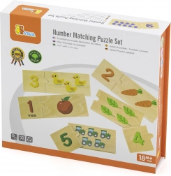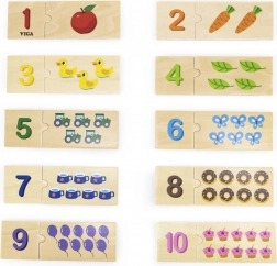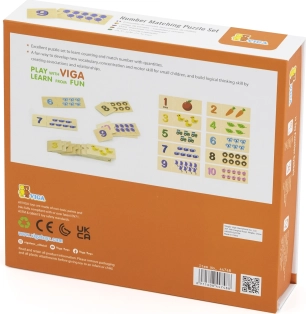 Ta odlična lesena sestavljanka VIGA je osredotočena na vadbo štetja in prepoznavanja števil. Otrok se s pomočjo teh sestavljank zlahka uči šteti, prepoznavati številke in k vsaki številki pravilno pripisati ustrezno količino predmetov. Z atraktivnimi barvami in slikami, kot so živali, plodovi ali vozila, otroci spoznavajo svet okoli sebe. Prav tako lahko razvijajo koncentracijo, besedni zaklad in logično mišljenje.