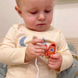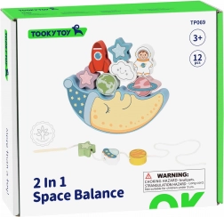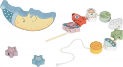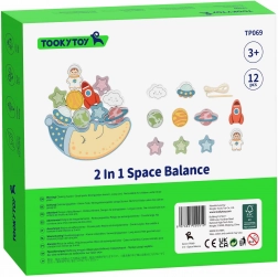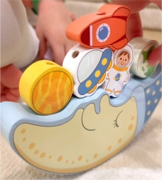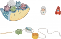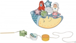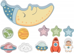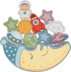 Prvi del kompleta je balansirni izziv: otroci poskušajo namestiti 10 barvnih blokov – raketo, astronavta, zvezde, NLP, planete in nasmejan oblaček – na speči obraz meseca, pri čemer se trudijo, da se konstrukcija ne poruši. To je odlična priložnost za vajo natančnosti in potrpežljivosti.