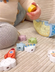 Drugi del ponuja kreativno igro nizanja: bloke je mogoče nizati s pomočjo lesene igle in vrvice, kar pomaga razvijati fine motorične spretnosti ter koordinacijo rok in oči.