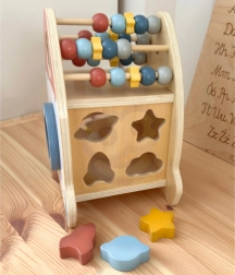 Igrača pomaga razvijati fino motoriko z interaktivnimi elementi, kot so kroglice in razvrščanje oblik.