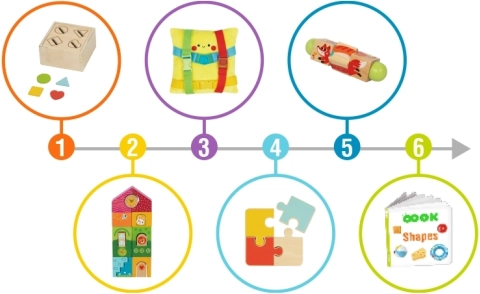Šest izobraževalnih aktivnosti v eni škatli razvija fino motoriko, koordinacijo oko–roka, logično razmišljanje ter prepoznavanje oblik in barv – z poudarkom na otrokovi samostojnosti.