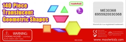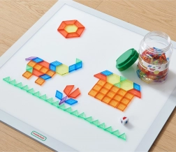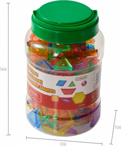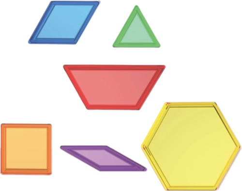 S tem bogatim kompletom 140 prozornih koščkov otroci sestavljajo slike, vzorce in mozaike, se učijo geometrije in odkrivajo simetrijo. Na voljo je 6 oblik (šesterokotnik, kvadrat, trapez, trikotnik, romb in paralelogram) v 6 izrazitih barvah, ki vabijo k neomejeni ustvarjalnosti.