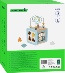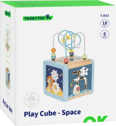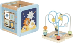 Lesena aktivna kocka z vesoljskim motivom znamke Tooky Toy prinaša otrokom od 18 mesecev ure zabave in učenja. Ponuja labirint z barvnimi kroglicami, razvrščanje oblik, vrtljive slikovne kocke, barvna zobata kolesa in drsne elemente, ki razvijajo fino motoriko, koordinacijo in logično mišljenje. Zaradi pastelnih barv in premišljene zasnove je kocka hkrati lepa in enostavna za shranjevanje – zgornji del z labirintom lahko pospravite v notranjost.