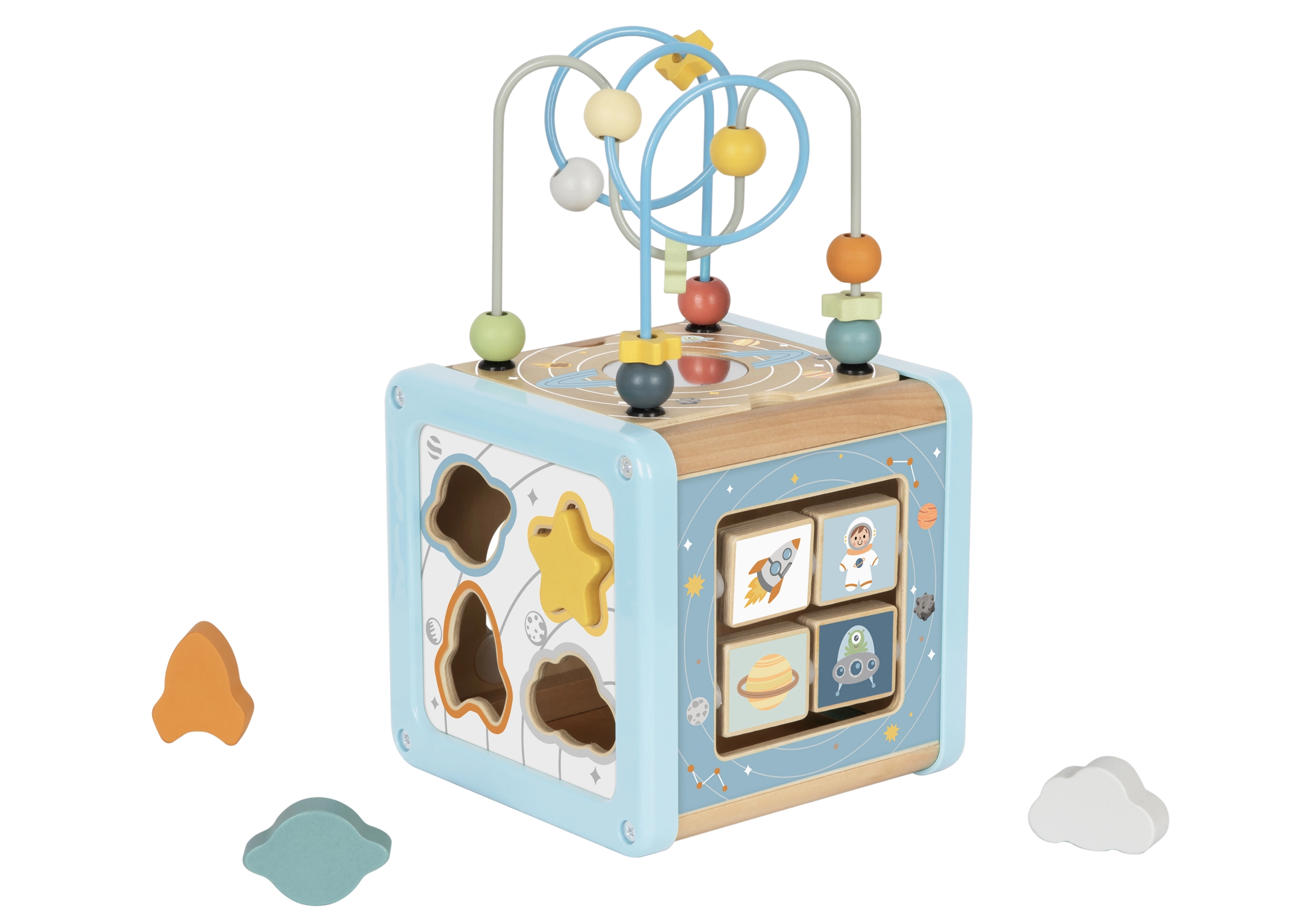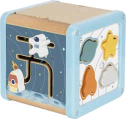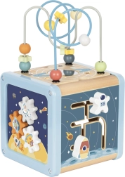 Odkrijte multifunkcijsko leseno aktivno kocko z vesoljsko tematiko, ki podpira naravni razvoj otroka. Otroci bodo vzljubili premikanje kroglic v labirintu, vrtenje slikovnih blokov z raketo, planetom in kozmonavtom, razvrščanje oblik ter vrtenje barvnih zobatih koles. Vsaka stran ponuja drugo dejavnost za razvoj fine motorike, koordinacije oko–roka in radovednosti.