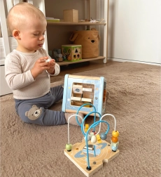 - 5 dejavnosti v 1: labirint s kroglicami, razvrščanje oblik, zobata kolesa, drsni elementi, vrtljive slike