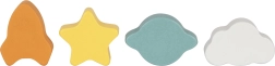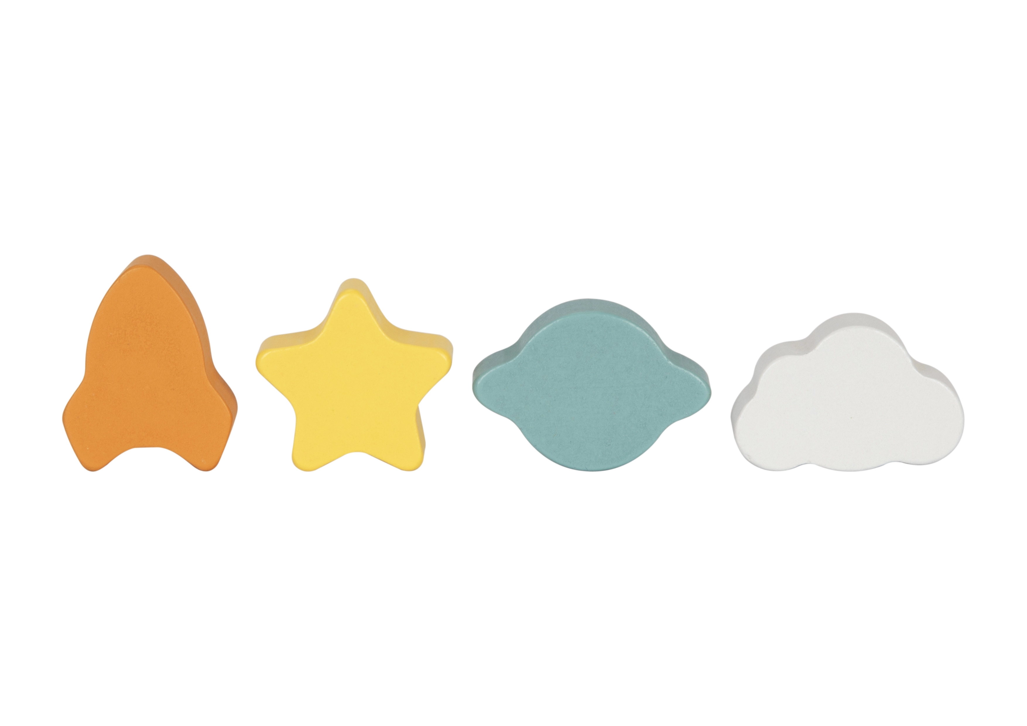 Odpirači v obliki planeta, zvezde, rakete in oblačka učijo otroke prepoznavati oblike in barve. Vstavljanje koščkov krepi logično mišljenje in prijem.