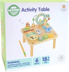 Multifunkcijska lesena mizica 5v1 znamke WOOPIE GREEN združuje zabavo in učenje v enem. Ponuja ksilofon, kroglični labirint, zobnike, razvrščanje oblik in gradbene/prepletalne elemente. Spodbuja fino motoriko, koordinacijo oko–roka, logično razmišljanje in čutno zaznavanje. Izdelana je iz naravnega lesa v pastelnih barvah in z varnimi premazi, idealna za otroke od 18 mesecev.