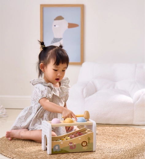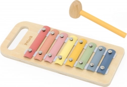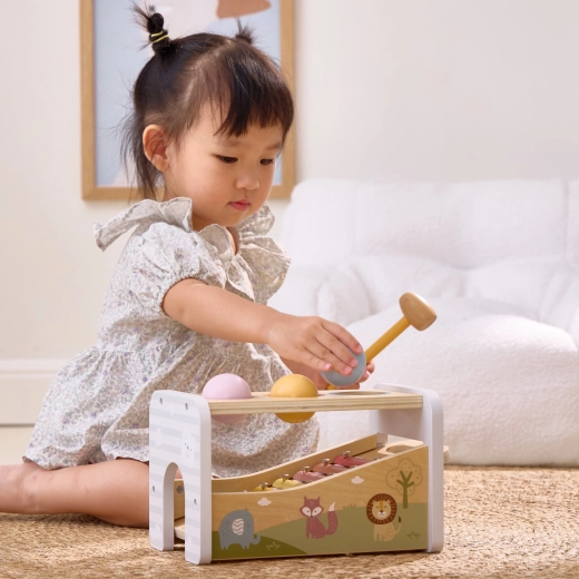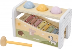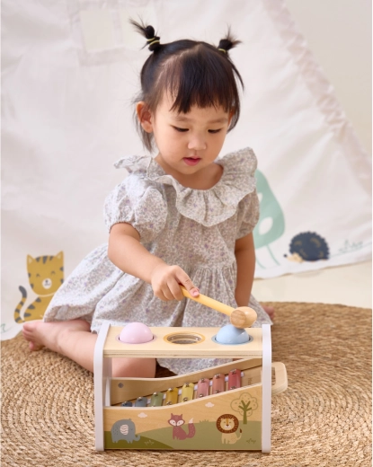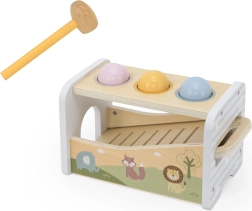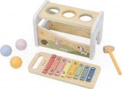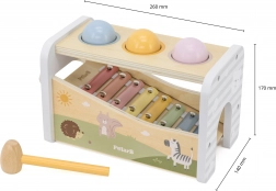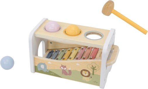 Ta vsestranska lesena igrača združuje tolkalno klop in ksilofon v en pameten komplet. Otrok lahko s kladivcem potolče barvne kroglice, ki se odkotalijo na kovinske tipke in zaigrajo prijetne tone, ali pa vzame paličico in ustvari lastne melodije.
