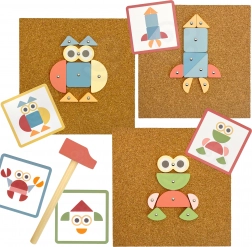 Celovit set z lesenimi oblikami, žebljički, kladivcem in plutasto ploščo. Otroci lahko sestavljajo po predlogah ali sledijo lastni domišljiji.
