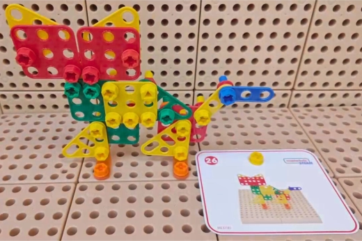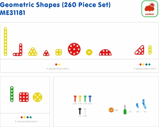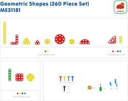 Ta celovit komplet vključuje kvadrate, trikotnike, kroge, polkroge in ploske trakove v več barvah, ki jih je zaradi odprtin enostavno pritrditi z vijaki na panele, mize ali vozičke Masterkidz. Otroci lahko ustvarjajo vzorce, rože in tudi zahtevnejše konstrukcije ter pri tem vadijo načrtovanje, izbiro elementov in dodelavo podrobnosti.