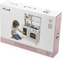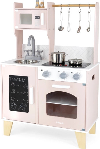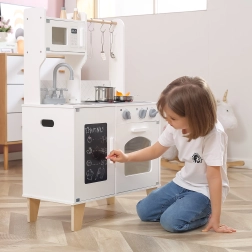 Stilska lesena kuhinjica VIGA PolarB otrokom prinaša ure kreativne igre in učenja. Vsebuje pomivalno korito, pečico, kuhalne plošče, mikrovalovno pečico in hladilnik s tablo za sporočila. Realistični elementi, kot so vrtljivi gumbi, odpirajoča se vratca in praktični kuhinjski dodatki, spodbujajo igranje vlog, samostojnost in odgovornost pri pospravljanju po kuhanju.