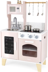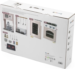 V kompletu je bogat nabor dodatkov: lonec s pokrovko, ponev, žlica, luknjasta lopatka, kuhinjska lopatica, komplet »zelenjave« ter solnica in mlinček za poper. Funkcionalne podrobnosti, kot so 3 vrtljivi gumbi, odpirajoča se vratca pečice in omarice ter obešalniki za pripomočke, igri dodajajo realističnost in razvijajo fino motoriko, ustvarjalnost in socialne veščine.