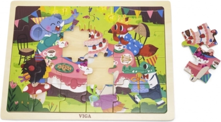Odkrijte kakovostno leseno sestavljanko VIGA z motivom rojstnodnevne zabave. Sestavljanka s 24 kosi je shranjena v leseni podlagi z vzorcem, vsak kos pa je oštevilčen od 1 do 24, kar otrokom olajša sestavljanje in spodbuja učenje števil. Primerno od 24 mesecev, pobarvano z netoksičnimi barvami.