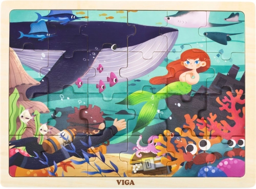 Otroške sestavljanke VIGA – Skrivnost morja prinašajo barvito podvodno ilustracijo z morsko deklico, potapljačem, ribami, koralnim grebenom in potopljeno ladjo. Zahvaljujoč lesenemu okvirju ostanejo kosi med sestavljanjem na mestu, slika na podlagi pa služi kot jasen vzorec.