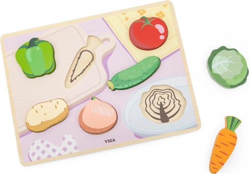 Lesena vstavljanka VIGA s 7 koščki v obliki priljubljene zelenjave (paprika, paradižnik, korenje, kumara, krompir, zelje in čebula) ponuja idealno kombinacijo učenja in igre. Otroci vadijo prepoznavanje oblik in barv, urijo ujemanje ter na zabaven način krepijo spomin in zbranost.