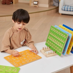 Stojalo je opremljeno s praktičnimi zatiči za stabilno vstavljanje posameznih plošč, tako da ima vsaka tabla ali sestavljanka svoje mesto. Kapaciteta do 10 kosov olajša rotacijo iger in aktivnosti ter omogoča učinkovito organizacijo in privlačno predstavitev.