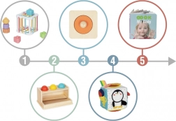 Igrače so barvite, varne in odlično sedejo v male ročice. S premišljenimi aktivnostmi si otroci urijo fino in grobo motoriko, koordinacijo, prepoznavanje barv in prostorsko predstavo. Knjiga z realnimi fotografijami podpira jezikovni razvoj in zavedanje lastnega telesa.