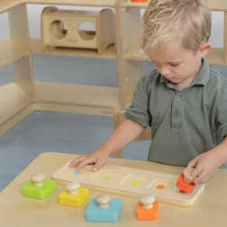 Leseni bloki in izrezane odprtine spodbujajo natančno delo rok in oči, ki ga otroci vadijo pri vstavljanju koščkov.