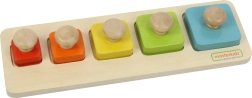 Lesena izobraževalna igrača, navdihnjena z Montessori metodo, je idealna za razvoj fine motorike, senzoričnih sposobnosti in koordinacije roka-oko pri otrocih. Sestavljena je iz petih kvadratnih blokov v različnih barvah in velikostih, ki jih otrok vstavi v ustrezna mesta na dvostranski osnovi: ena stran vsebuje barvne pikice za lažje ujemanje, druga stran pa le izrezane odprtine za povečanje zahtevnosti.