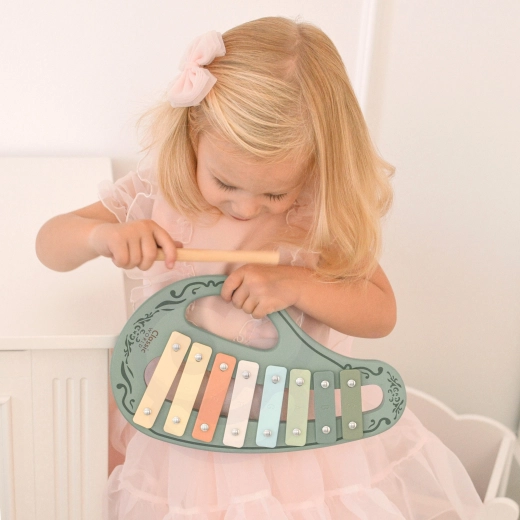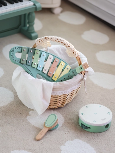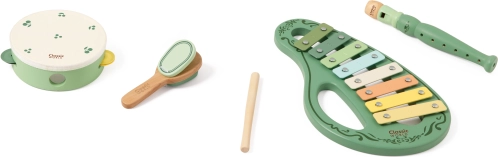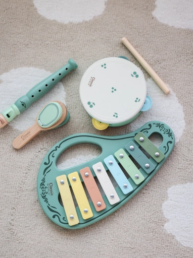 Ta stilski komplet v vintage izvedbi vsebuje vse, kar malčki potrebujejo za odkrivanje sveta zvokov: cimbale (ksilofon), tamburin, blokflavto, kastanjete in paličico. Zaradi kombinacije lesa in kovine imajo instrumenti prijeten zvok in prenesejo vsakodnevno igranje.
