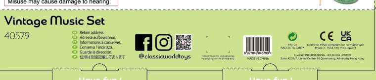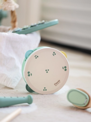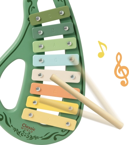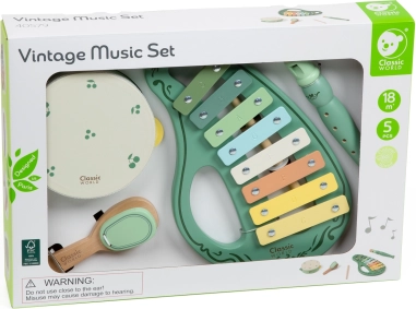 Odkrijte veselje do glasbe s tem lesenim vintage kompletom glasbenih instrumentov znamke CLASSIC WORLD. Pastelne barve, kakovostna izdelava in varni, zaobljeni robovi naredijo komplet idealno izbiro za prve glasbene korake. Spodbuja kreativnost, ritem in posluš ter je popolno darilo za otroke od 18 mesecev naprej.