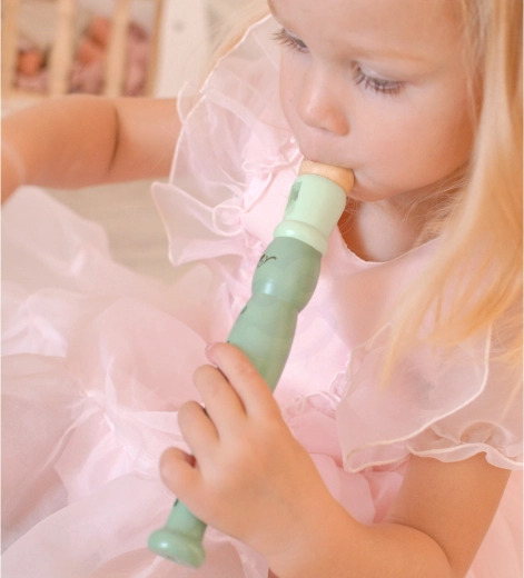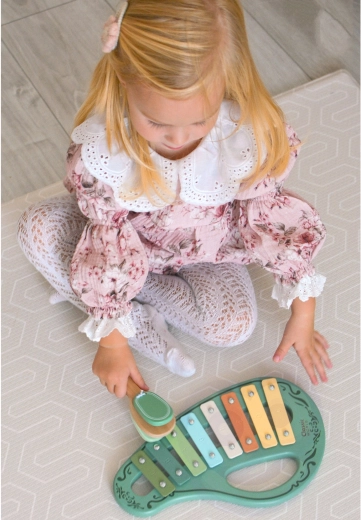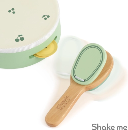Instrumenti so izdelani iz lakiranega lesa in barvani z netoksičnimi barvami. Ergonomske oblike lepo sedejo v majhne ročice ter spodbujajo fino motoriko, občutek za ritem in glasbeno izražanje. Idealno za skupno družinsko zabavo in prve glasbene urice doma.