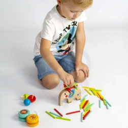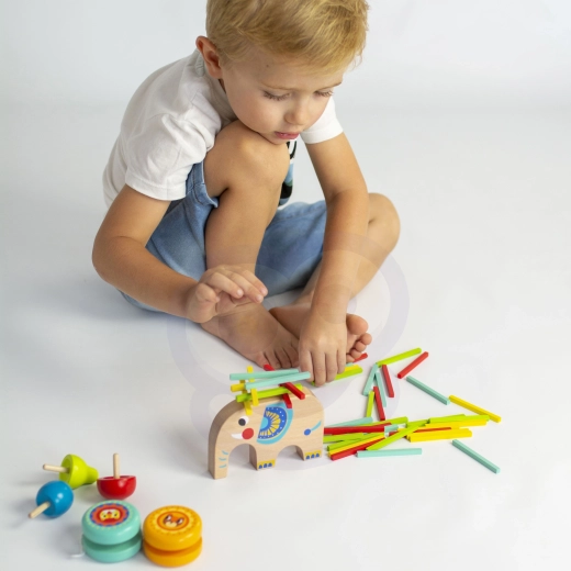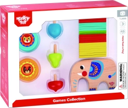 Ta pisani 46-delni leseni komplet združuje več priljubljenih iger v eno pakiranje. Otroci lahko uravnotežijo palčke na hrbtu slona, gradijo stolp ali vodnjak, igrajo mikado, vadijo trike z dvojico jojov in merijo, čigava vrtavka se bo vrtela dlje. Odlično za samostojno igro in družinsko tekmovanje.