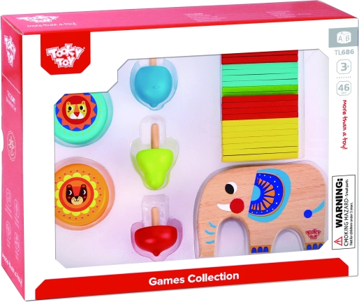 Odkrijte vsestranski leseni komplet iger znamke TOOKY TOY, ki otrokom prinese ure ustvarjalne zabave. Prisrčen slon služi kot osnova za zlaganje, barvne palčke za mikado, v kompletu pa sta tudi dve jojoti in vrtavka. Igra spodbuja fino motoriko, koordinacijo in potrpežljivost, izdelana je iz varnih in nestrupenih materialov in odlično razvija logično mišljenje.