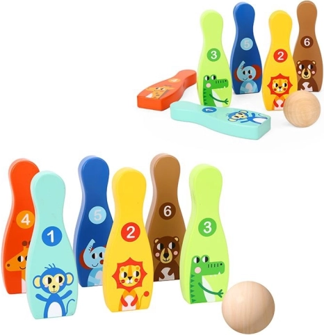 Leseni bowling komplet s šestimi barvnimi keglji in žogico je idealna igra za otroško sobo. Vsak kegelj ima živalski motiv in oštevilčenje 1–6, zato otroci med igro naravno urijo štetje, prepoznavanje barv ter razvijajo motorične spretnosti.