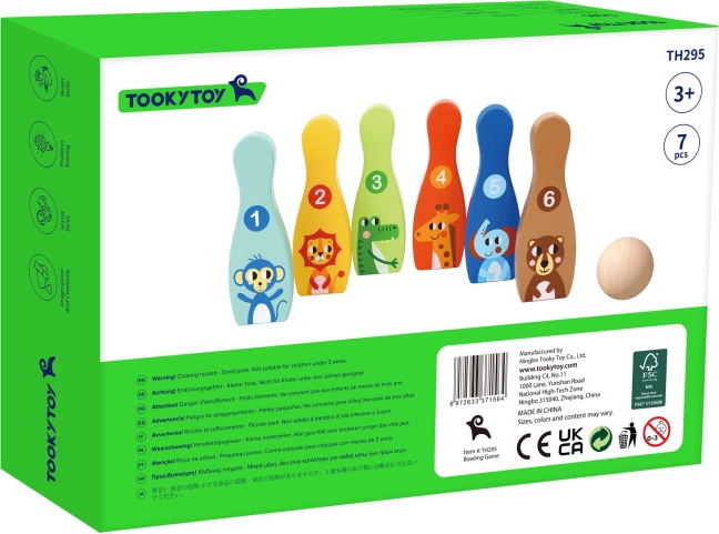 Lesene otroške keglje z živalicami 6 kos + žogica TOOKY TOY