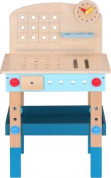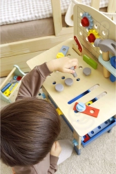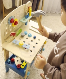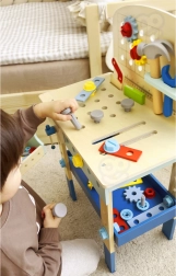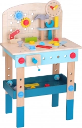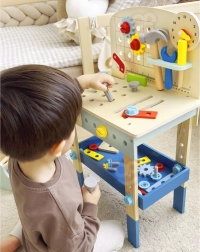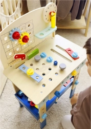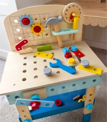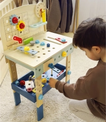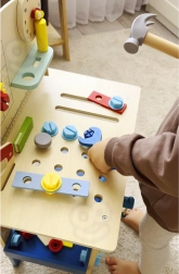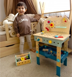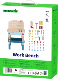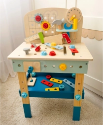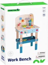 Lesena delovna miza blagovne znamke Tooky Toy je uresničitev sanj vsakega malega mojstra. Ta komplet vsebuje mizico skupaj z različnimi igračnimi orodji: žagico, kladivcem, ključem, izvijačem, primežem, merilom, vijaki, maticami, podložkami in zobniki. Zahvaljujoč policam in držalom na mizi bodo imele otroke vse potrebno pri roki, dele kompleta pa je mogoče pritrditi na mizico. Igrača je varno zasnovana za otroke, robovi in vogali so zaobljeni, da se preprečijo poškodbe.