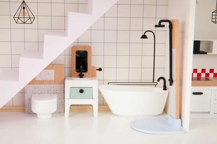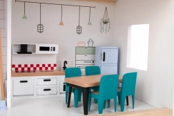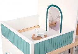 Vsako nadstropje ima jasno določeno funkcijo – od kuhinje in kopalnice do dnevne sobe ter spalnice z balkonom. Otroci zlahka ustvarjajo lastne zgodbe.