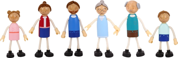Set vključuje 6 lesenih figuric družine s premičnimi okončinami, ki spodbujajo domišljijo, socialne veščine in igranje vlog. Hiška je izdelana iz kakovostnega lesa, prebarvana z varnimi, nestrupenimi barvami v pastelnih odtenkih in zasnovana tako, da prenese vsakodnevno igro.