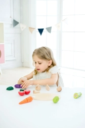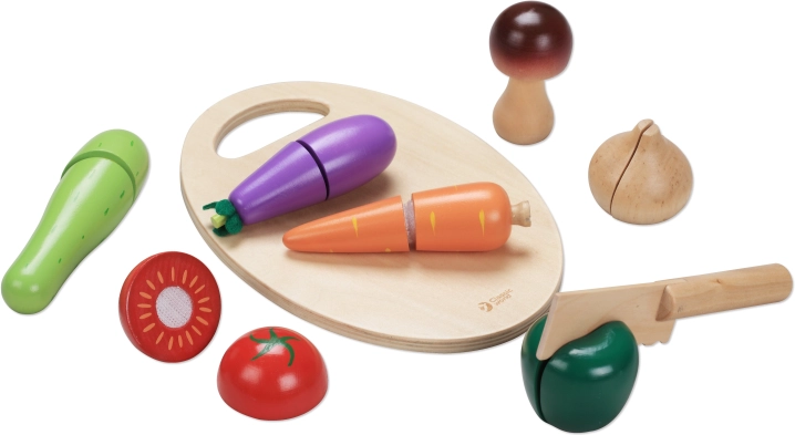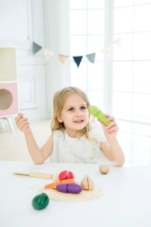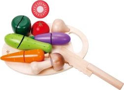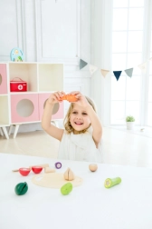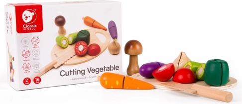 Ta leseni set za rezanje zelenjave znamke CLASSIC WORLD je idealen za male kuharje, ki radi posnemajo svet odraslih. Deli zelenjave so povezani z ježkom, zato jih lahko otroci z lesenim nožem »režejo« in znova sestavljajo – zabavno, varno in poučno.