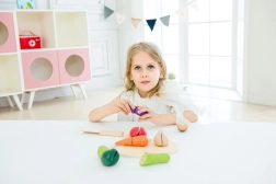 Barvni koščki zelenjave so spojeni z ježkom – otroci jih lahko znova in znova režejo in sestavljajo brez tveganja za poškodbe.
