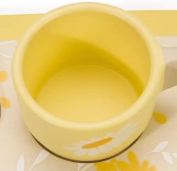 Set vsebuje krožnik, pribor, skodelico, sol, poper, jajce, popečene kruhke, rezino slanine in drugo.