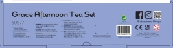 Komplet vključuje velik pladenj, krožničke za skodelice, čajnik, skodelice, žličke in sladice.
