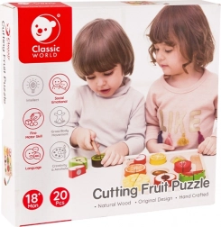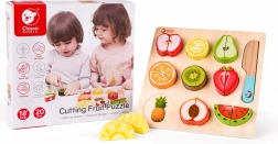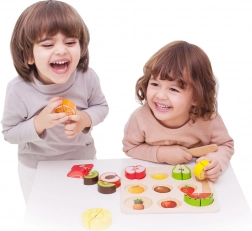 Set vsebuje 20 delov, vključno z obojestransko desko, nožičkom in različnimi sadji. Ta varna igrača za otroke od 18 mesecev je izdelana iz lakiranega lesa in prebarvana z nestrupenimi barvami, kar zagotavlja, da je popolnoma varna za uporabo.
