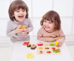 Otroci izboljšujejo motorične spretnosti pri sestavljanju in rezanju sadja z lesenim nožem.